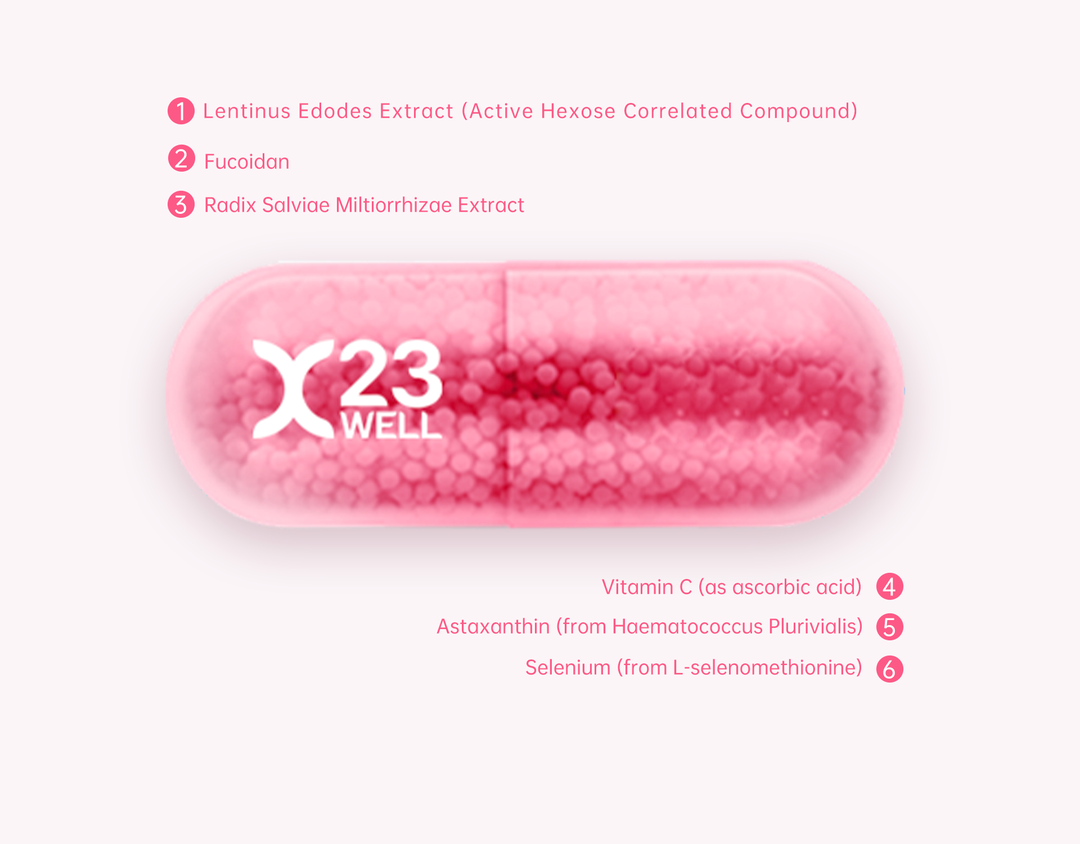 TIC Proprietary Complex capsule contains 60 micrograms of the 'Immune Ace'—Selenium, as well as four other compound ingredients from TIC: 'Golden Algae'—Fucoidan, 'Blood Circulation Remedy'—Radix Salviae Miltiorrhizae Extract, 'Antioxidant Shield'—Astaxanthin, and 'Immune All-Rounder'—Vitamin C, which helps boost defense mechanisms and activate natural killer cells (NK). Combined with the 'Anti-H Sniper'—Active Hexose Correlated Compound (AHCC)¹, it alleviates various discomforts.